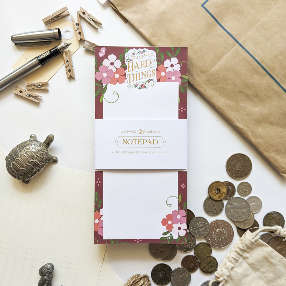 Whether you're jotting down groceries, planning a project or scribbling a mid-tea brainwave, this notepad brings a little joy to your everyday life and keeps encouragement within reach. You can do hard things!